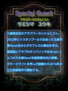アラブパーカッショニストのウエシマユウキ先生をお迎えし、パフォーマンスして頂きます❣️ 先生の演奏は、ベースの安定した技術に、音を楽しむリズム、ロックな遊び心などオリジナリティ溢れています